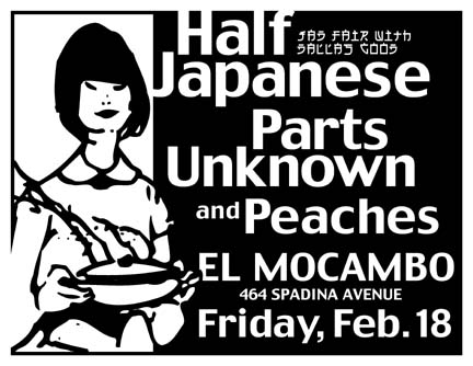 On February 18, 2000; Half Japanese swing their tour North of the border to Toronto's El Mocambo club; where Parts Unknown & Peaches will be providing support. This particular date will see Jad Fair reunited with local legend Dallas Good (who was part of Phonocomb when they collaborated on an album with Jad Fair; Half Japanese's front man). Half Japanese have existed since 1977, and Jad Fair has also done several collaborations with people of varying notoriety. For a more detailed look at them; click the following link: http://brianb.home.texas.net/hj/ |